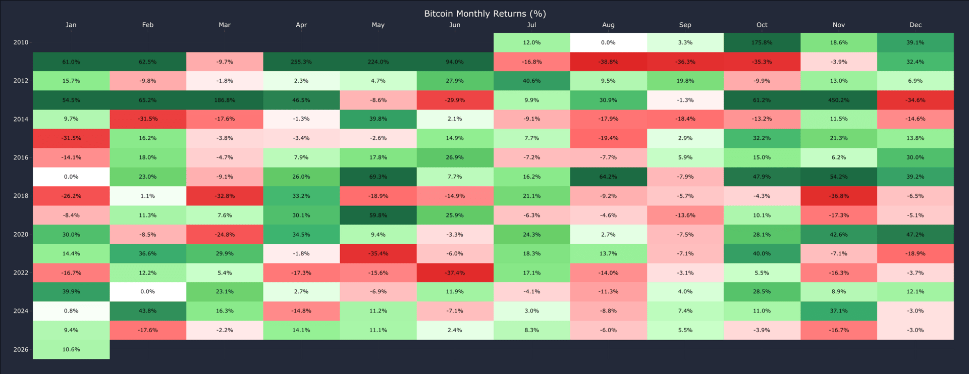The Bitcoin Monthly Returns Heatmap shows Bitcoin's performance each month compared to the previous month's price.