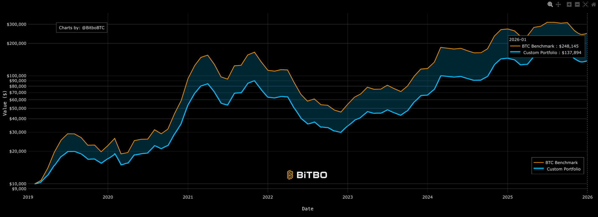 This tool lets you visualize a custom portfolio of Bitcoin, Gold, S&P 500, and Cash versus a Bitcoin Benchmark based on your allocations and start date.
